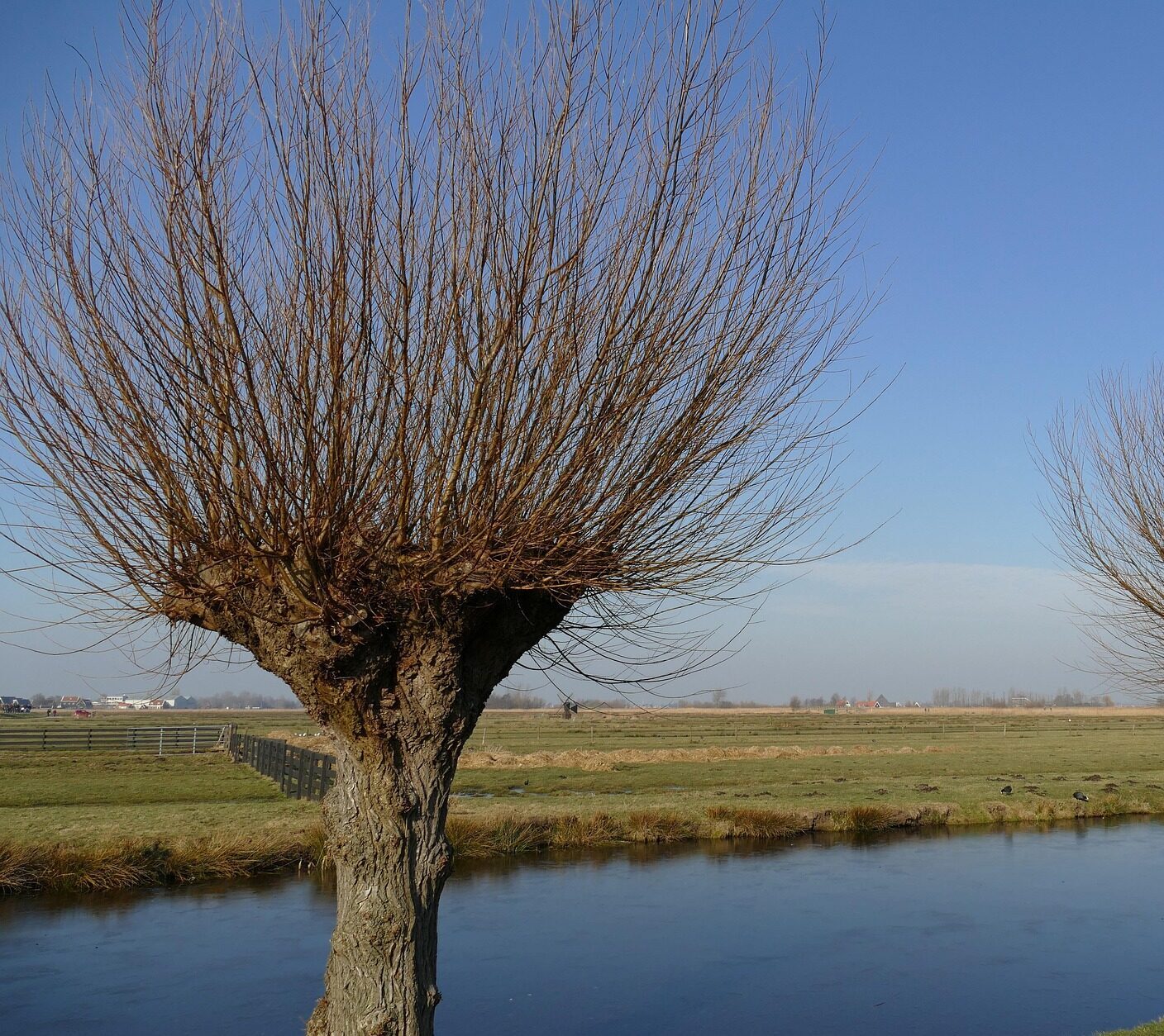 De winter en vroege voorjaar is het moment voor het knotten van wilgen. We kennen het allemaal wel. Maar toch, het heeft ook iets aparts, want alle takken van deze mini-bomen worden afgezaagd. Dat vind ik best wel bloeddorstig. Het gebeurt om de zoveel jaar en daar waar de takken zijn afgezaagd ontstaat een dikke hobbelige kruin. Toch heeft de wilg er geen last van, sterker nog, hij vaart er wel bij. Alsof het zich ontdoen van oude ballast hem nog meer laat stralen en tot zijn recht laat komen… In de lente zijn er kleine knoppen naast de afgezaagde tak die voorzichtig en nieuwsgierig uitgroeien tot een kleine twijgje. En, sterk als de wilg is, in een jaar tijd uitgroeit tot ranke slanke tak die zo stevig is dat het stormen kan weerstaan. Het knotten is een eeuwenoud gebruik, zelfs in de prehistorie werd dit al gedaan. De wilgentenen werden voor veel doeleinden gebruikt. Als veevoer en voor het vlechten van manden en bijenkorven. Maar ook in de waterbouw werden en worden deze soepele wilgentakken graag gebruikt als oeverbeschoeiing of als zinkstukken. De wilg heeft dus vele toepassingen. Maar een leuke bijkomstigheid is dat juist het knotten deze boom tot een klein natuurparadijs maakt. De dikke hobbelige plek waar de takken zijn afgezaagd, ook wel de stoel genoemd, geeft talloze verstophoekjes voor insecten en spinnen. Om daar te wonen en om eitjes af te zetten. Vogels zijn ook niet gek dus vogels zijn vaste bezoekers van deze Mac Knotwilg. De wilg bloeit als een malle en de rijke gele katjes bomvol stuifmeel laten hommelkoninginnen na de winter aansterken voor het nieuwe seizoen. Nog een bijzondere eigenschap van juist knotwilgen is dat zij makkelijk gaten en holten krijgen in hun stam. Kleine gaatjes in het zachte hout worden al gauw comfortabele en veilige woonsteden voor kleine knagers als muizen, nestplekken voor boomkruipers en een schuilplek voor de steenuil. Zelfs eenden zijn te vinden op de kruin van een knotwilg, die hier ‘hoog en droog’ hun kinderen uitbroeden. Denk hier nog even het weelderige bloeiende fluitenkruid bij, dat in witte wolken dit paradijsje omgeeft en je hebt een hemel op aarde!
