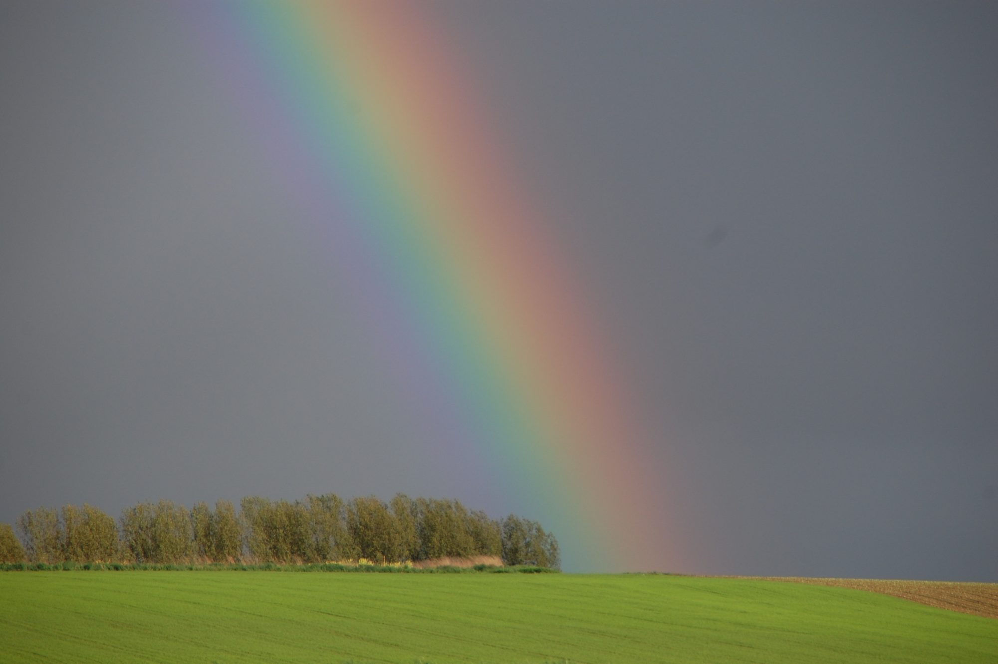 Ik laat mijn gaspedaal los en ga naar de rechterbaan … dit is te mooi om langs te racen. Tussen de grijze wolken priemt de zon in al haar glorie en maakt een kleurenspektakel in de lucht. De kleuren van dit bijzondere natuurfenomeen zijn diep en intens. Fenomenaal! Zo heb ik een regenboog nog nooit gezien. Ik zie waar hij de grond raakt…zou daar een pot met goudstukken staan?!